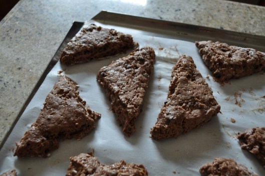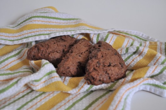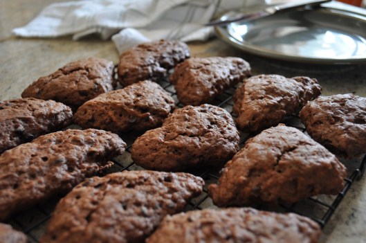 Once the scones were out of the oven and had cooled on a wire rack for a few minutes, I eagerly picked one out to try. Its thin, delicate crust was a pale, shiny brown. I split it open and took a bite. The crumb was light and moist, speckled with fudgy bits where the chocolate chips had melted into the tender dough, but the crisp edges provided a bit of texture. The floral acidity of the lemon brought out the spicy fruit notes of the cocoa, and the flavor was powerfully chocolaty. These were not scones for a child’s tea party, but ones for thoroughly grown-up palates, dark and intense enough on their own to yield a cup of coffee superfluous. (Not that this should stop you, if you enjoy a cup of coffee with your scone.) A generous smear of sweet, creamy butter to play opposite the bittersweet cocoa was all that I wanted. And then I nibbled the scone as slowly as I could, treasuring every last bite.