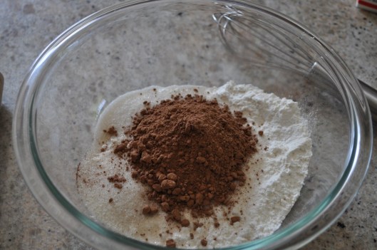 - Whisk together the flour, sugar, cocoa powder, baking powder, and salt in a large bowl.