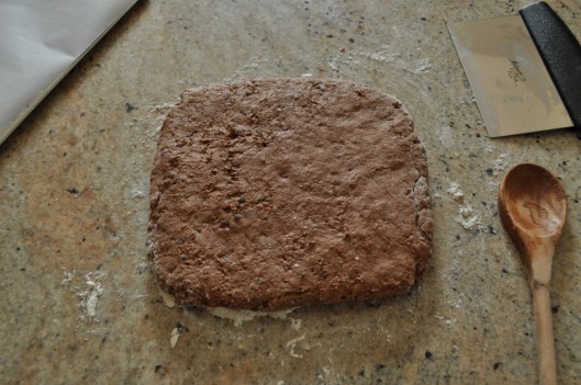 Then you can either form the dough into a large, rough square, slice it into nine smaller squares and cut each square crosswise into two triangles; or you can divide the dough in half and form each half into a round that gets cut into eight wedges. I find the squares a little easier to work with, but the circle-into-wedges method was the original way I was taught at school. Whichever way you choose, use a butter knife that has been dipped into a glass of water to cut the dough, wiping off and re-wetting the blade between each cut. The difference this makes is amazing. Using a wet knife to make cutting a wet dough easier seems rather counter-intuitive, but it works. Please don’t ask me why. I have no idea.