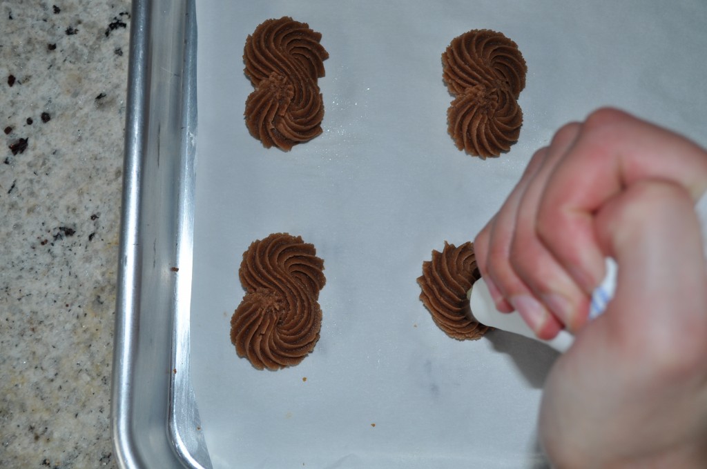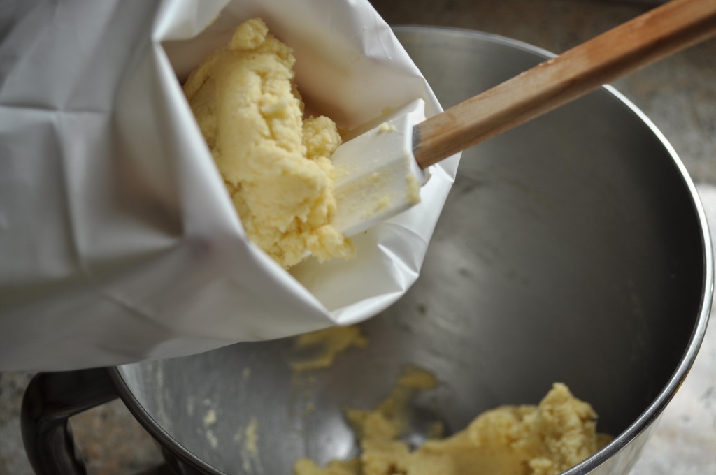 - Use a rubber spatula to transfer some of the dough into the pastry bag. Unfold the cuff, and twist the bag shut. Don’t put all the dough in at once; it’s much easier to pipe the cookies when you only have a small amount of dough in the bag.