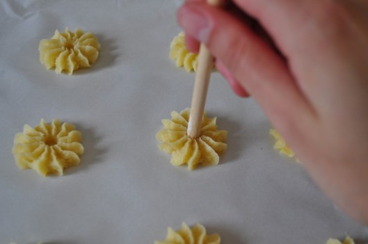 - Once you have filled an entire tray, take a dowel, dip the end of it in some confectioners’ sugar or flour, and make an indentation in the center of each star. Put the small round tip into the other pastry bag, and fill the bag with a few tablespoons of the seedless jelly.
