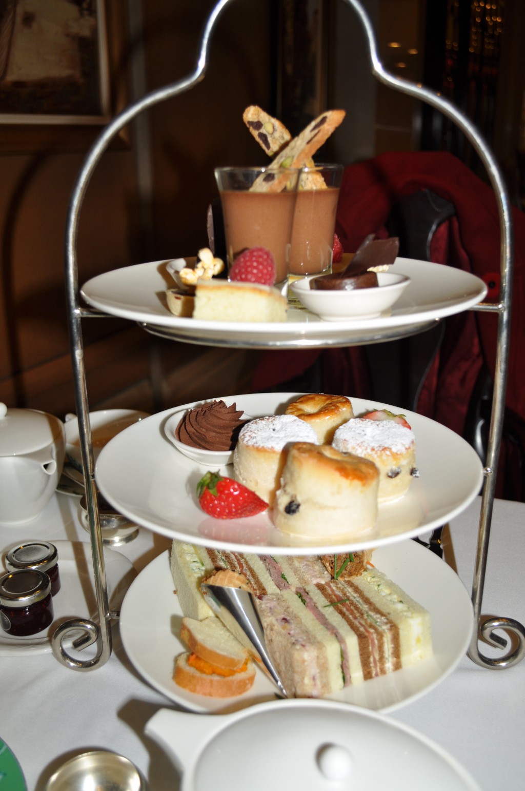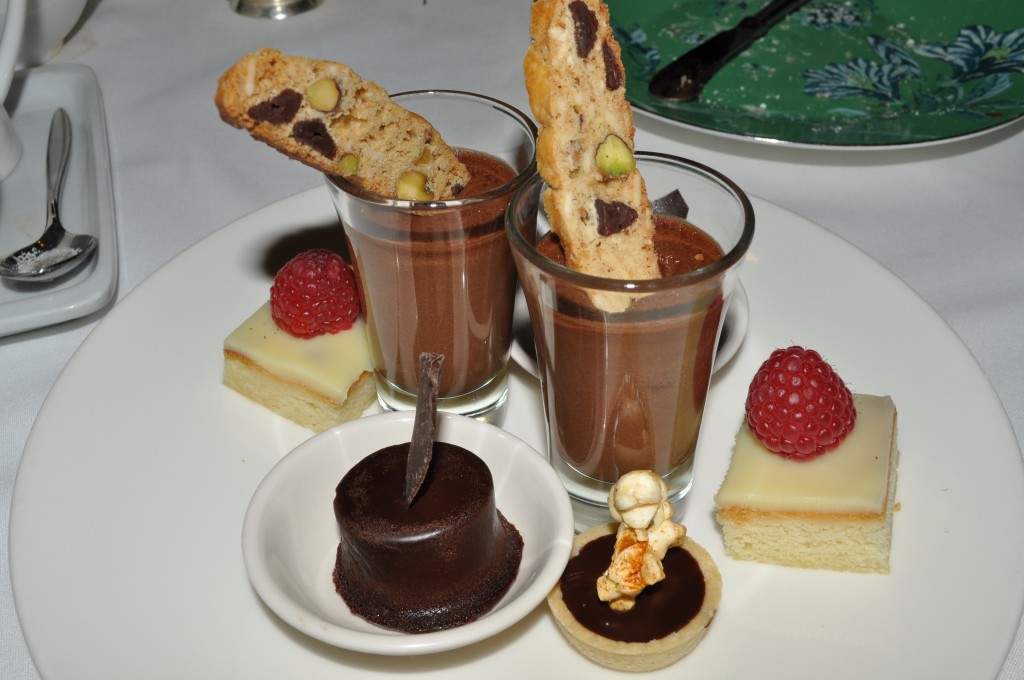 Of course, there were also the contents of the three-tiered silver stand to enjoy. The array of exquisite little sandwiches was the same as the one that comes with their usual tea, with the special addition of a cocoa butter-brushed sesame cone (I thought it tasted like a fortune cookie—but in a good way!) filled with duck confit. The non-chocoholic sandwiches were delicious as well. I especially liked the salmon and cucumber sandwich on pumpernickel bread (and I usually don’t like salmon), and its scrumptious accompanying red onion-and-caper cream cheese spread. I also was much impressed by the egg salad sandwich, which used avocado as well as mayonnaise to give creaminess and flavor, with the unusual addition of chopped scallions providing some welcome “bite.”