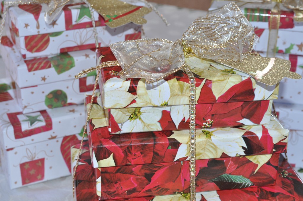 Securing the boxes with ribbonOnce I had filled all of the boxes with goodies, I secured them with appropriately festive ribbon and then wired on some lovely, gauzy silver-and-gold bows that I had been tremendously lucky to find. I was actually in the cooking department of the store looking for a new candy thermometer, and someone else had just happened to have left the bows on the shelf there—one of those little providences that makes life so delightful.