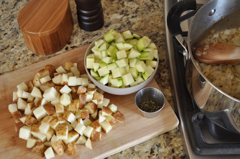 - Stir the zucchini into the cooking potatoes and onions. Season with salt and black pepper. Put the lid back on and let the vegetables cook for a few more minutes. Then pour in the stock and bring up to a boil.