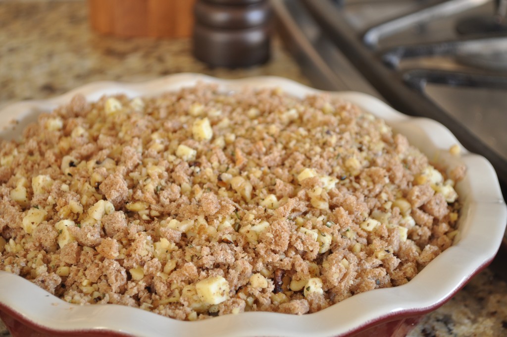 - While the filling is cooking, prep the ingredients for the crumble topping. Then toss the breadcrumbs with the chopped walnuts, reserved rosemary, and crumbled cheddar. Season with salt and black pepper.