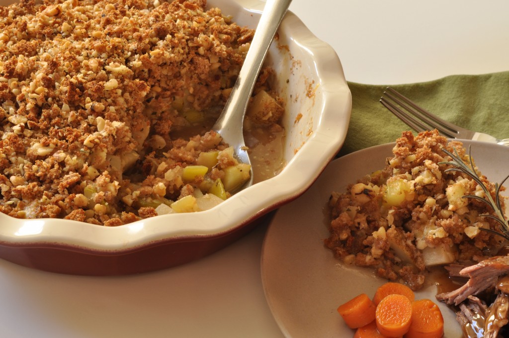The dish starts off by gently cooking onions in butter until they are lovely and golden, then adding fragrant rosemary—the essence of fall in my opinion—and rough chunks of potatoes and zucchini. A bit of stock is added for moisture, and then the hot filling is poured into an ovenproof dish (I used a ceramic pie pan; Nigel used a cast-iron skillet) and sprinkled with a few generous handfuls of cheese. The whole dish is blanketed under a savory concoction of walnuts and breadcrumbs, enhanced with still more cheese and rosemary, and then baked until gorgeously crisp and golden.