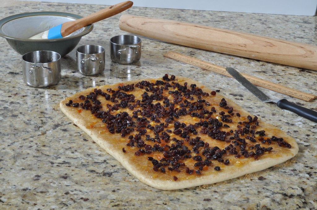 - Use a small offset spatula to spread the marmalade over the sugar, and then strew the currants uniformly across the rectangle of dough.
