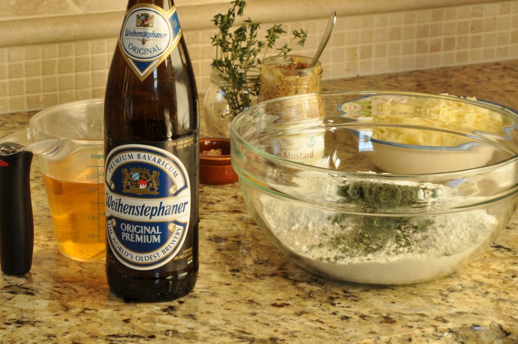 - Whisk the mustard into the beer, and pour the mixture into the bowl with the dry ingredients.