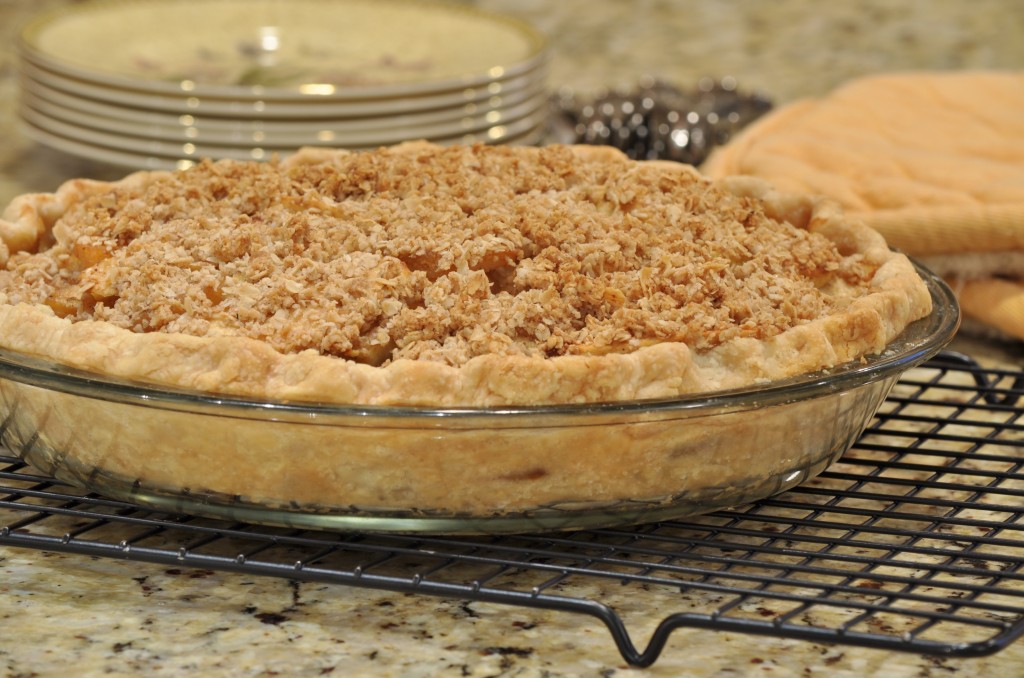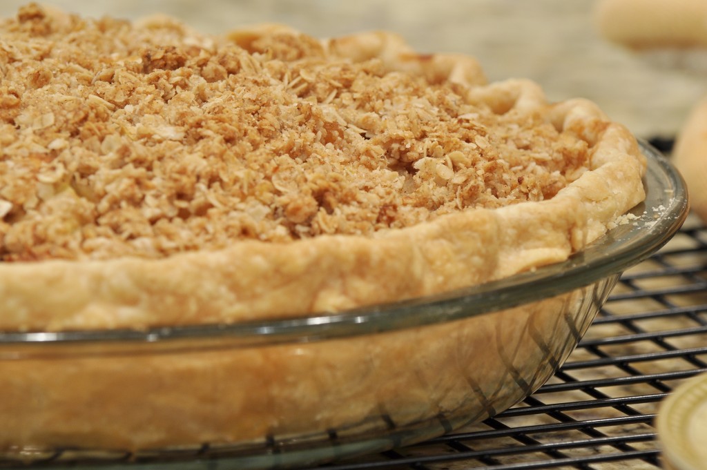 - Remove the prepared piecrust from the refrigerator and pack the filling tightly inside. Sprinkle the streusel topping evenly over the fruit.