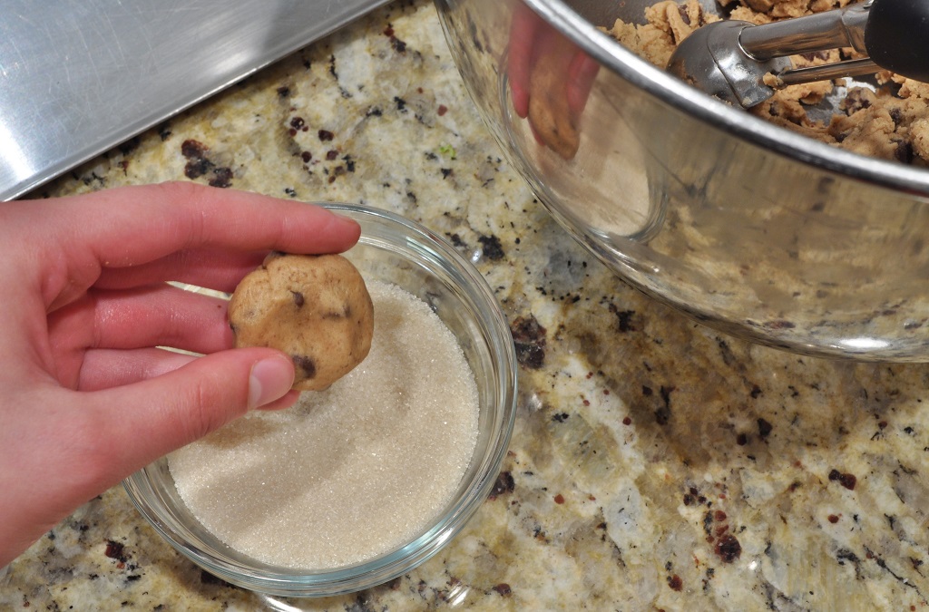 1 cup all-purpose flour ¼ teaspoon baking powder ¼ teaspoon cinnamon 1 tablespoon espresso powder ¾ cup (5 oz.) unsalted butter, at room temperature ½ cup confectioners’ sugar ¼ cup brown sugar ¾ cup chocolate chips Granulated sugar for dippingTechnique: