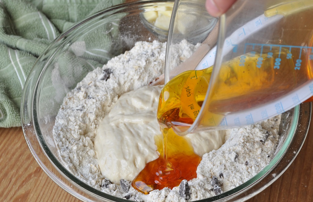So, after a good deal of cookbook studying, I wrote out a tentative recipe and gave it a try. I used the yeast-sponge method and a combination of granulated sugar and golden syrup for sweeteners. I added chocolate chunks and espresso powder—I told you I was addicted to baking with it—and included rolled oats, rather than nuts.