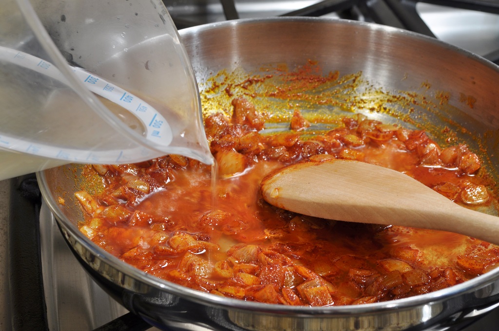 8. Return the pan to the stove and turn up the heat to medium. Add the chicken stock and bring to a boil, stirring to scrape any browned bits off the bottom of the pan.