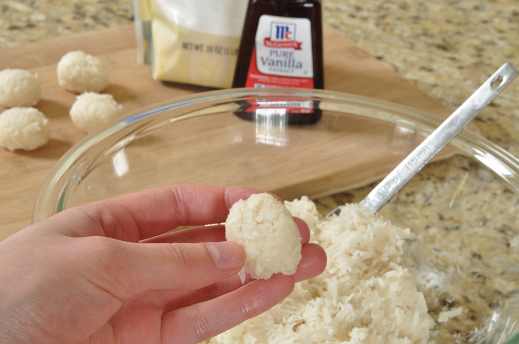 - Scoop out tablespoons of the coconut filling and roll them into egg-shaped ovals between the palms of your hands.