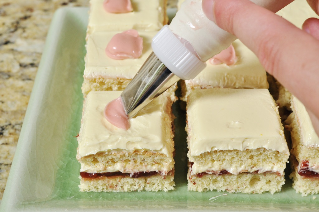 - Use a long serrated knife to trim off any uneven edges, and then cut the cake into 1 ½-inch squares. Wipe the blade of the knife off between cuts, so you don’t smear raspberry jam onto the top layer of buttercream.