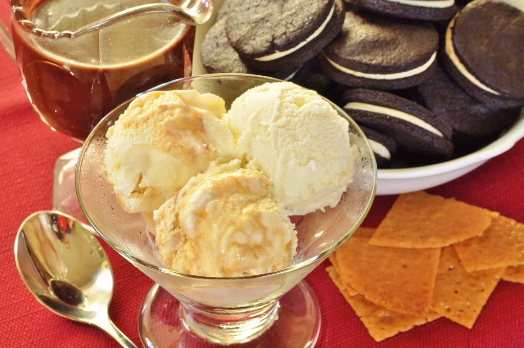 - When you are ready to serve your ice cream sundaes, place one or two scoops each of vanilla and salted caramel ice cream in a glass, crumble over a few Hydrox cookies, ladle over some hot fudge sauce, and garnish with a honey tuile.