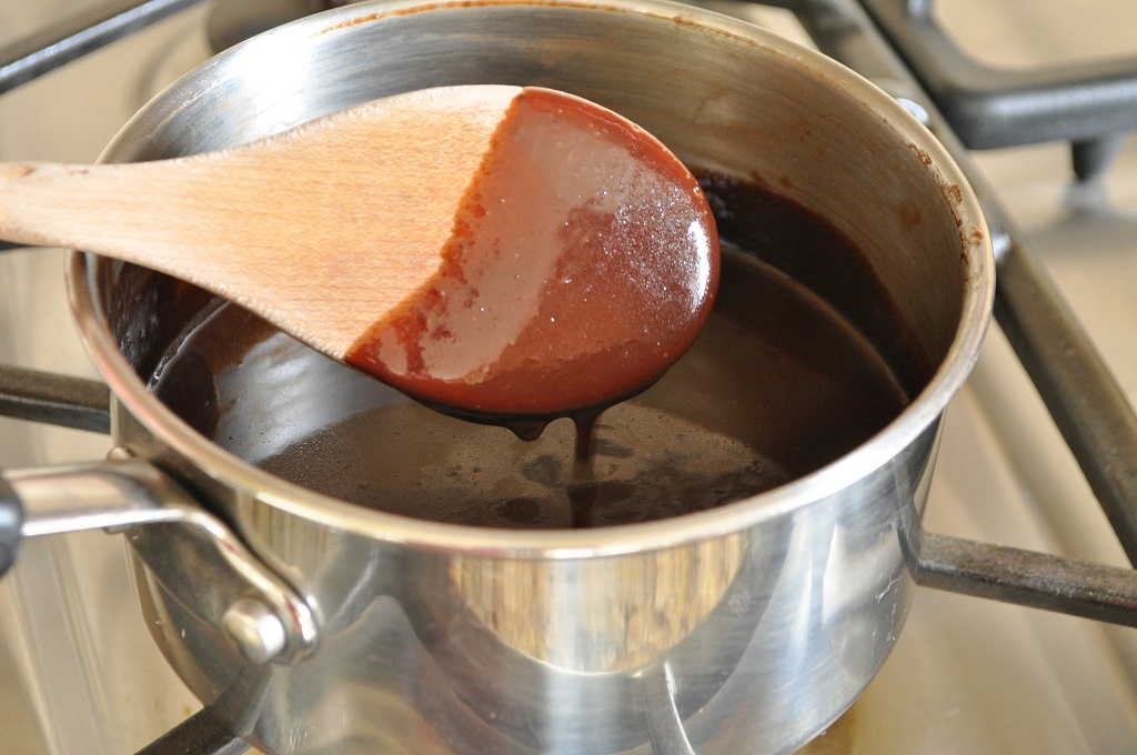 - Whisk in the boiling water, brown sugar, corn syrup, honey, jam, and espresso powder; turn up the heat; and bring to a boil.