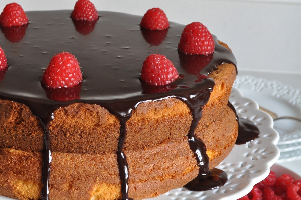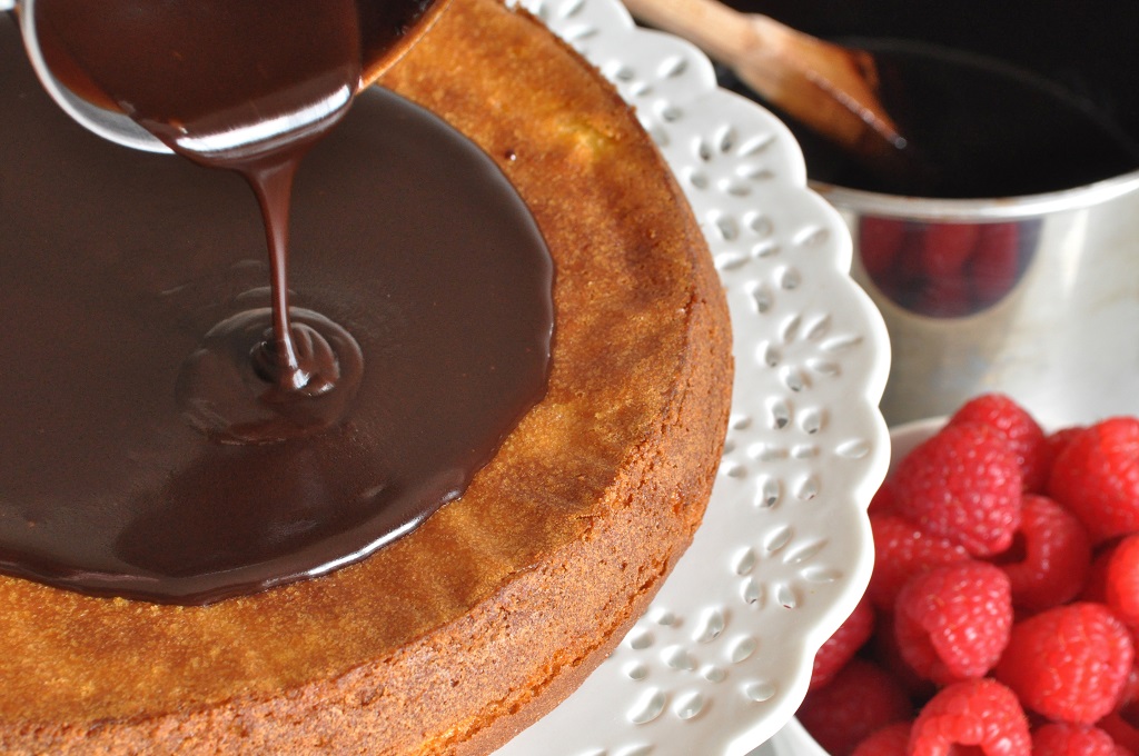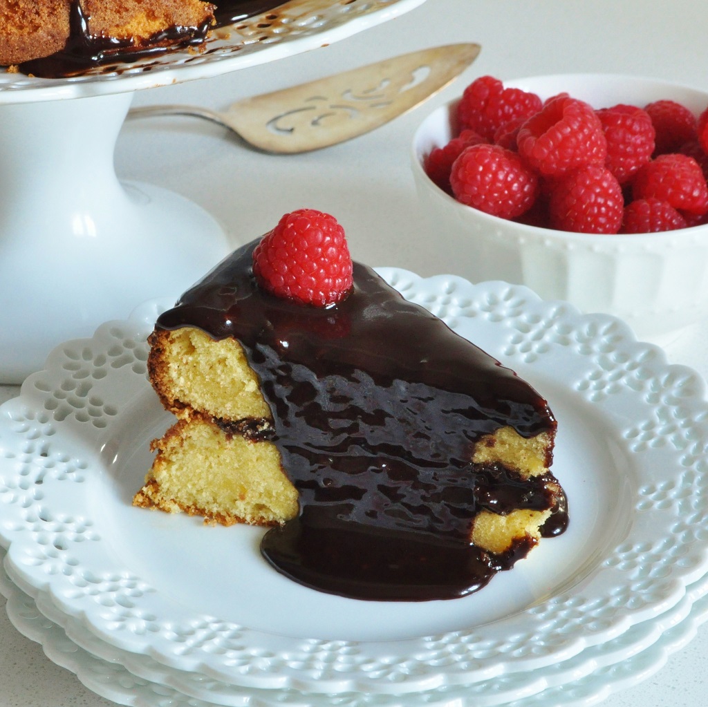 I decorated my cake with raspberries, simply because I happened to have them on hand, but now I am convinced that they are a necessary addition to the dessert. Their bright acidity tempers the decadent combination of thick, glistening fudge sauce and rich, moist golden cake perfectly.