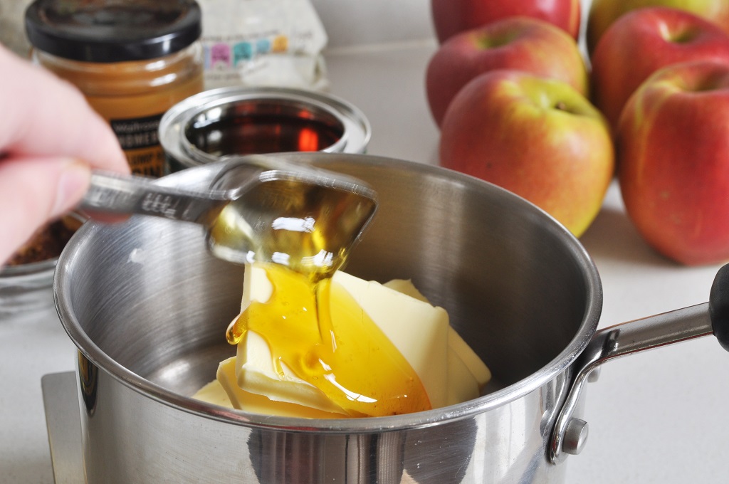2. In a small saucepan over low heat, melt together the butter and golden syrup for the flapjack base.