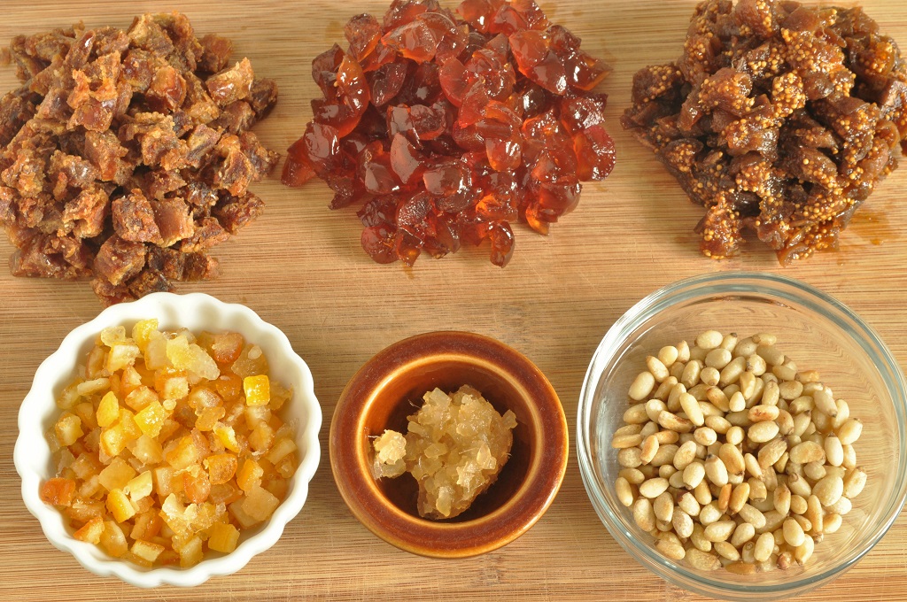 I did it! Almonds, pine nuts, cocoa, cinnamon, ginger, cloves, nutmeg, black pepper, honey, brown sugar, vanilla, figs, dates, cherries, lemon, orange, vanilla—a grand total of seventeen!