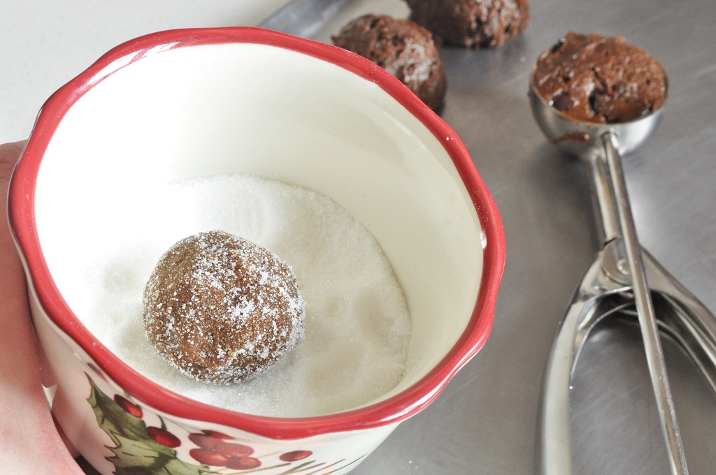 - Roll the shaped cookies in the granulated sugar, coating them thoroughly, and then place them on ungreased cookie sheets, spacing two inches apart. (You should get two trays of sixteen.)