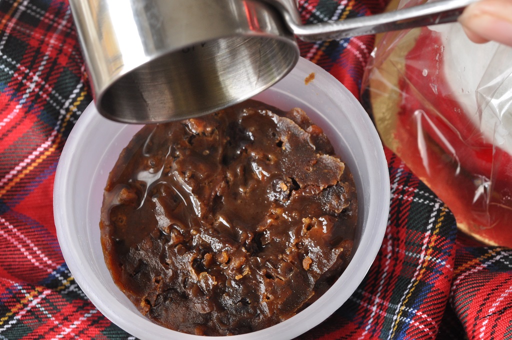 Once the tartan wrapping was off of this one, I was delighted to find that it had arrived in a reusable plastic cup with graduated measurements marked on the side–so handy! I love it when companies use packaging that can be kept and used, rather than just thrown away. The instructions on the lid said to prick the pudding with a fork, pour a tablespoon of brandy or rum over it, and then microwave for 60 to 90 seconds.