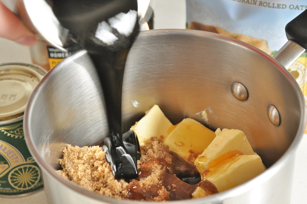 - In a medium saucepan, combine the butter, golden syrup, treacle and sugar.
